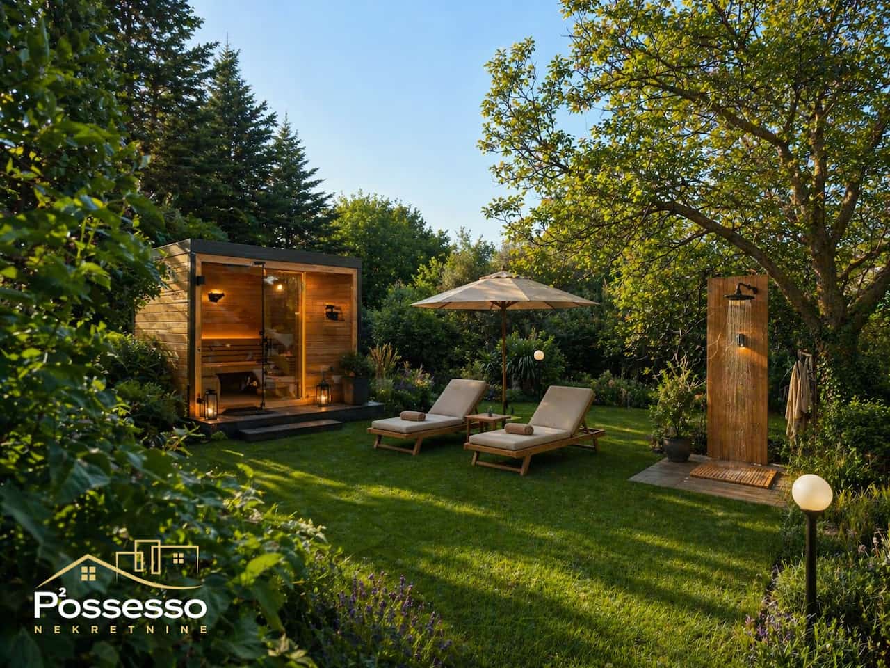 Okućnica iznosi cca 609 m² te postoji mogućnost dodatnog uređenja vanjskog prostora, uključujući i izgradnju bazena.